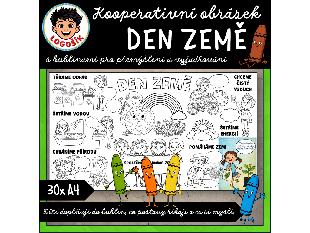 Tento kooperativní obrázek nabízí hotové řešení. Děti společně tvoří velký obrázek, doplňují do bublin, co postavy říkají a co si myslí, a přirozeně si tak rozvíjejí vyjadřování, přemýšlení i spolupráci.