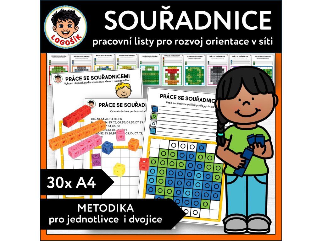 Soubor Souřadnice je zaměřený na rozvoj orientace v síti hravou, přehlednou a praktickou formou. Děti pracují se souřadnicemi v podobě písmeno–číslo, podle zadání vybarvují obrázky, zapisují souřadnice jednotlivých políček a převádějí hotový obrázek do zápisu. Nepracují tedy jen s čísly, ale skládají konkrétní obrázky, což je pro ně motivující a vede je k přesnosti i soustředění.