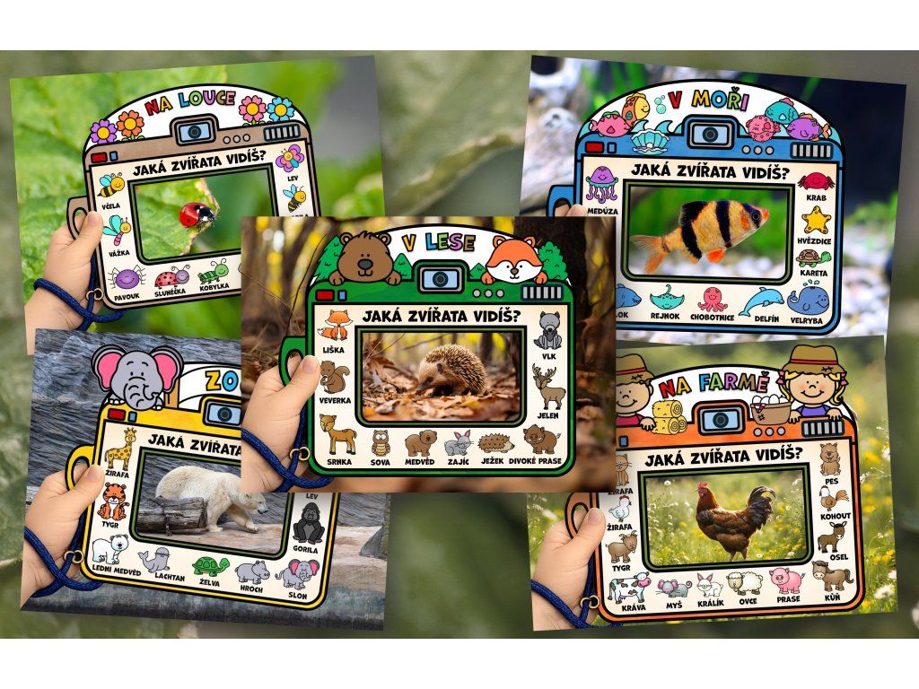 Materiál „Fotografem zvířat“ je sada tematických rámečků, které vedou děti k aktivnímu pozorování a pojmenovávání toho, co skutečně vidí. Každý rámeček je zaměřený na konkrétní prostředí (les, louka, farma, zoo, moře) a po obvodu nabízí obrázky typických zvířat, které dítěti pomáhají vybavit si správná slova.