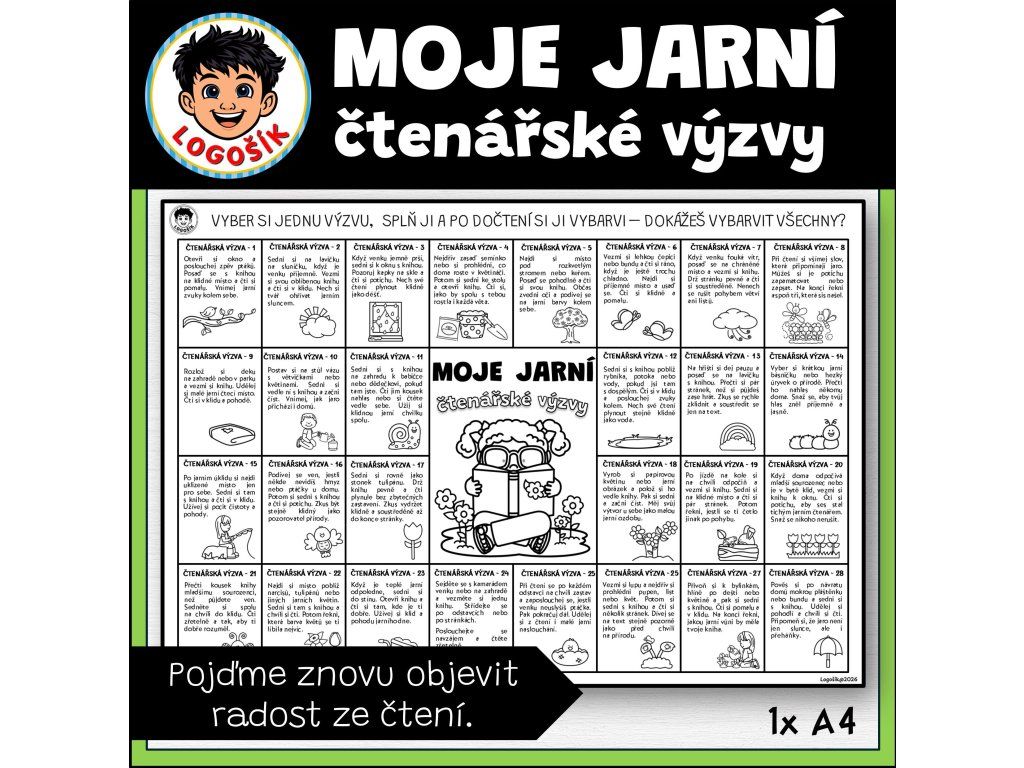 Moje jarní čtenářské výzvy přinášejí 28 hravých úkolů, které dětem ukazují, že číst se dá pokaždé jinak. Každá výzva vede dítě krok za krokem – mění prostředí, zapojuje smysly, pracuje s pozorností i tempem čtení.