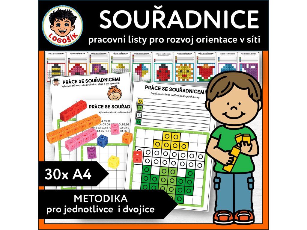 Soubor Souřadnice je zaměřený na rozvoj orientace v síti hravou, přehlednou a praktickou formou. Děti pracují se souřadnicemi v podobě písmeno–číslo, podle zadání vybarvují obrázky, zapisují souřadnice jednotlivých políček a převádějí hotový obrázek do zápisu. Nepracují tedy jen s čísly, ale skládají konkrétní obrázky, což je pro ně motivující a vede je k přesnosti i soustředění.