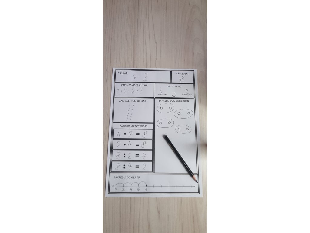 V některých úlohách, jako jsou například „Vypočti“, „Najdi správný příklad“ nebo „Spoj příklad s výsledkem“, je přirozeně využita i možnost zaměnit pořadí činitelů. Dětem je tak nenápadně nabídnuto pochopení, že u násobení na pořadí čísel nezáleží – a tuto vlastnost začínají samy využívat jako pomůcku při výpočtech.