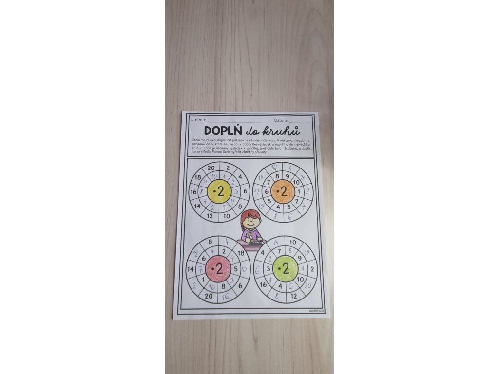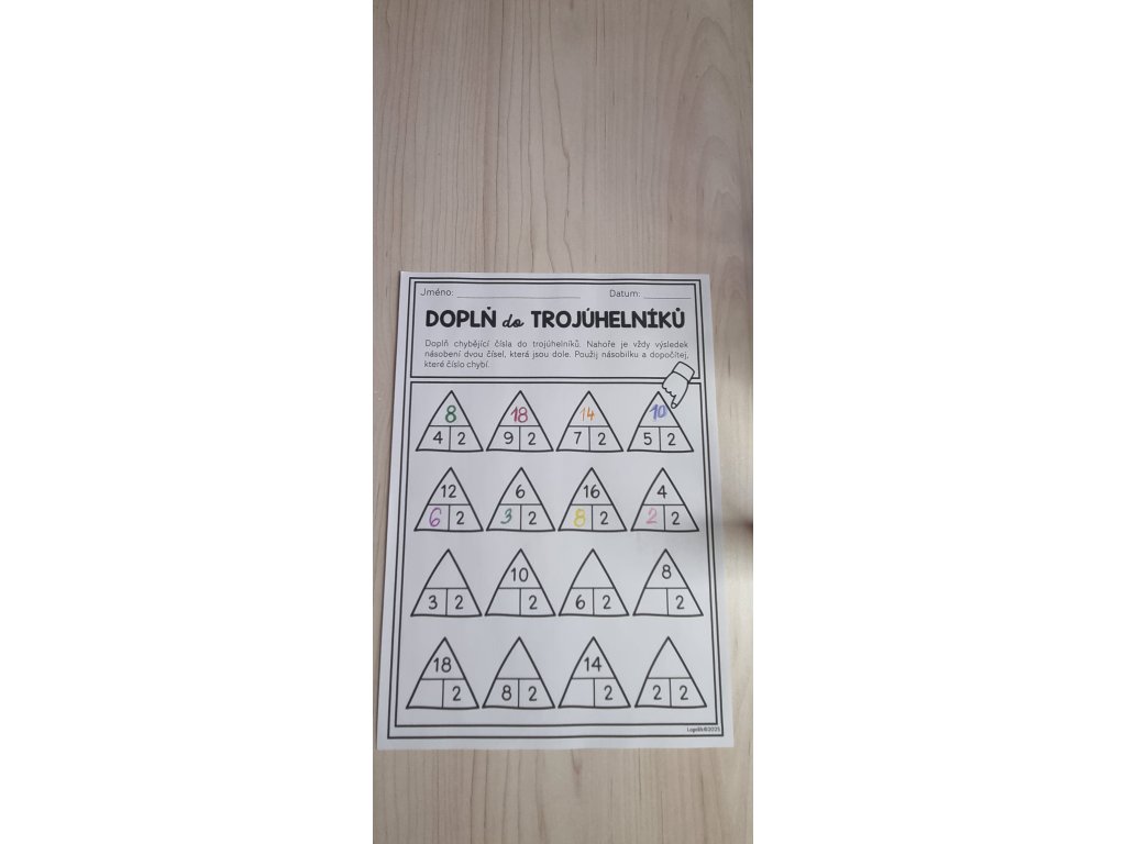 Práce s kruhy a trojúhelníky rozvíjí dovednost doplňovat násobilkové vztahy. Buď je zadáno číslo, kterým se násobí, nebo výsledek, který mají děti doplnit. Tato práce rozvíjí schopnost obracet úlohu (dělení jako opačnou operaci násobení), kontrolu výsledků i odhad.