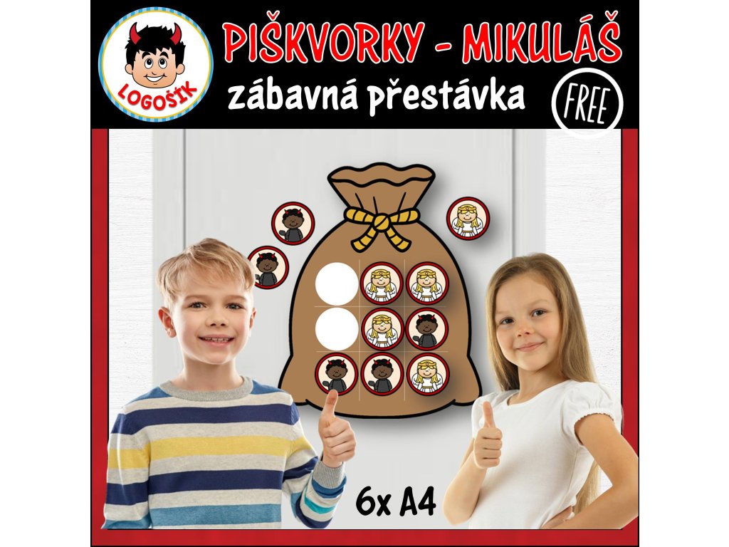 Zábavná mikulášská aktivita, která dětem nabídne rychlou hru během výuky nebo přestávky. Součástí materiálu je herní plocha ve tvaru čertovského pytle a tematické žetony anděla a čertíka. Stačí slepit, umístit na dveře, skříňku nebo magnetickou tabuli a připravit žetony na magnet, suchý zip nebo opakovaně lepicí hmotu. Děti mohou okamžitě začít hrát.