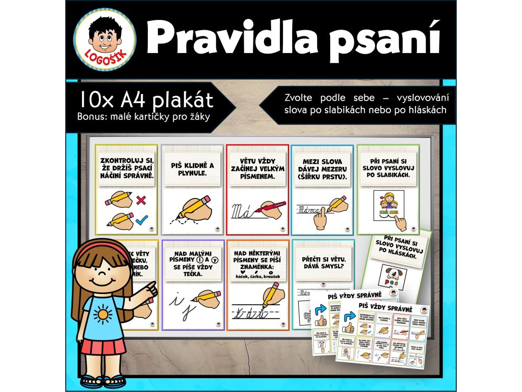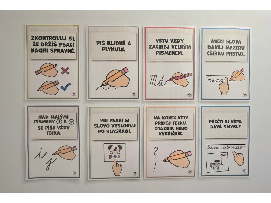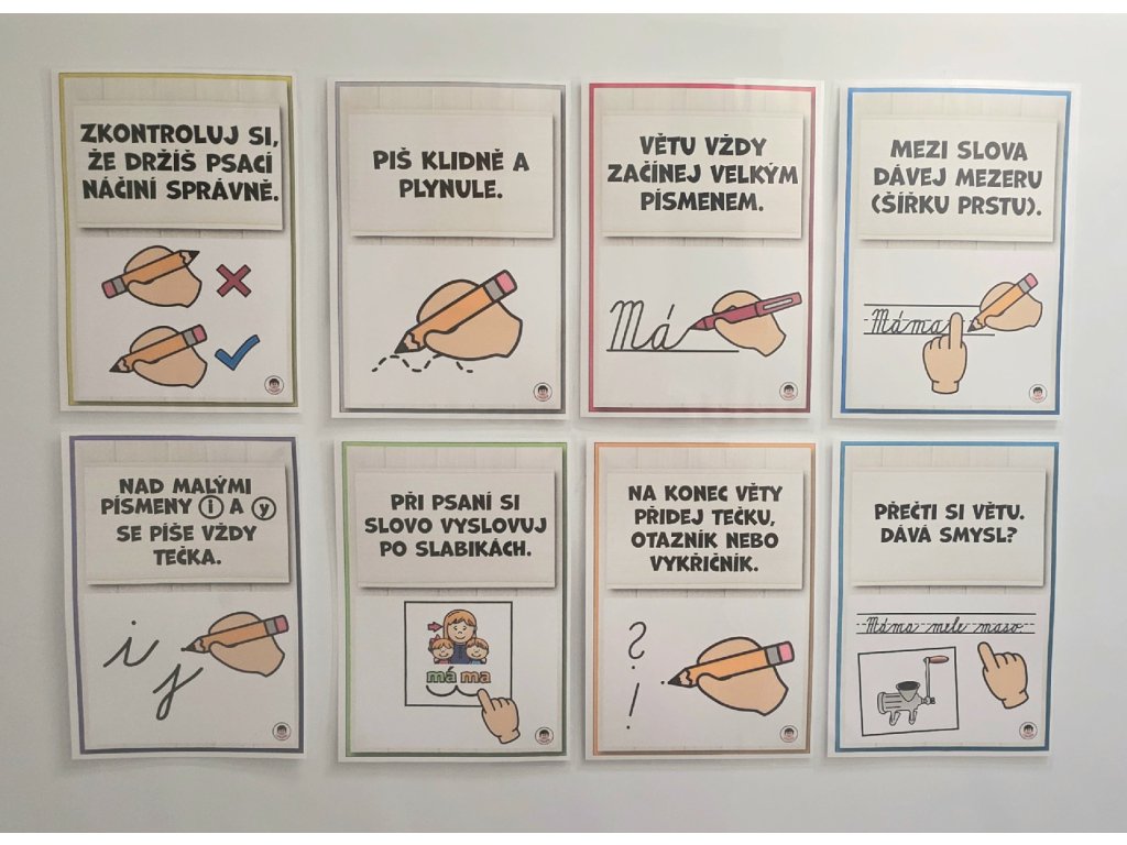 Soubor deseti přehledných plakátů názorně připomíná dětem základní pravidla psaní. Najdete zde všechno, co malé školáky při psaní nejčastěji trápí – správné držení psacího náčiní, klidné a plynulé psaní, začátek věty velkým písmenem, mezery mezi slovy, vyslovování po slabikách nebo hláskách, interpunkci na konci věty, tečky nad písmeny i a j, háčky a čárky nad dalšími písmeny i kontrolu, zda napsaná věta opravdu dává smysl.