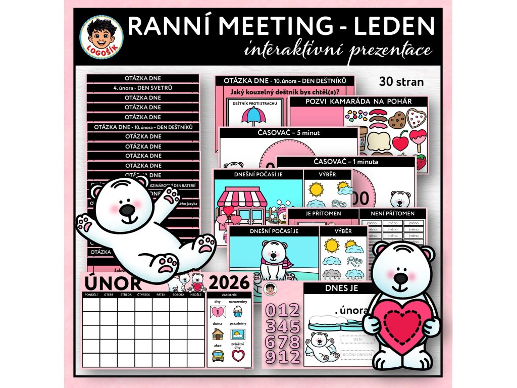 Interaktivní prezentace Ranní meeting – únor je určená pro každodenní práci s dětmi na 1. stupni základní školy. Slouží jako přehledný a klidný ranní start vyučování, který dětem pomáhá zorientovat se v průběhu dne, naladit se na práci a vytvořit strukturovaný začátek dne.