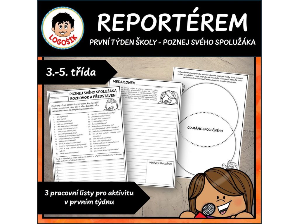 Soubor tří pracovních listů Reportérem – Poznej svého spolužáka je určený pro 3.–5. třídu a představuje ideální aktivitu pro první školní dny. Děti se prostřednictvím role „reportéra“ učí vést rozhovor, zapisovat odpovědi a převyprávět je vlastními slovy. Na základě otázek připraví krátký medailonek svého spolužáka, který pak představí celé třídě.