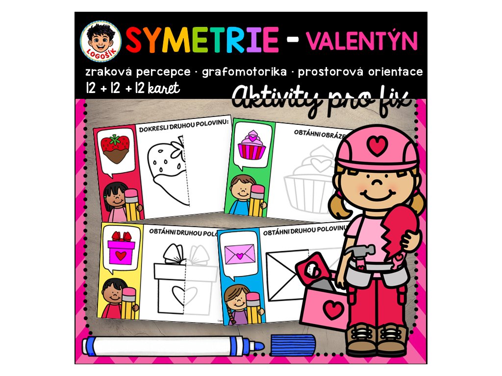 Valentýnský tematický soubor zaměřený na rozvoj zrakové percepce, grafomotoriky a prostorové orientace prostřednictvím práce se symetrií. Děti si hravou formou procvičují obtahování, doplňování a dokreslování obrázků s motivy lásky a Valentýna.