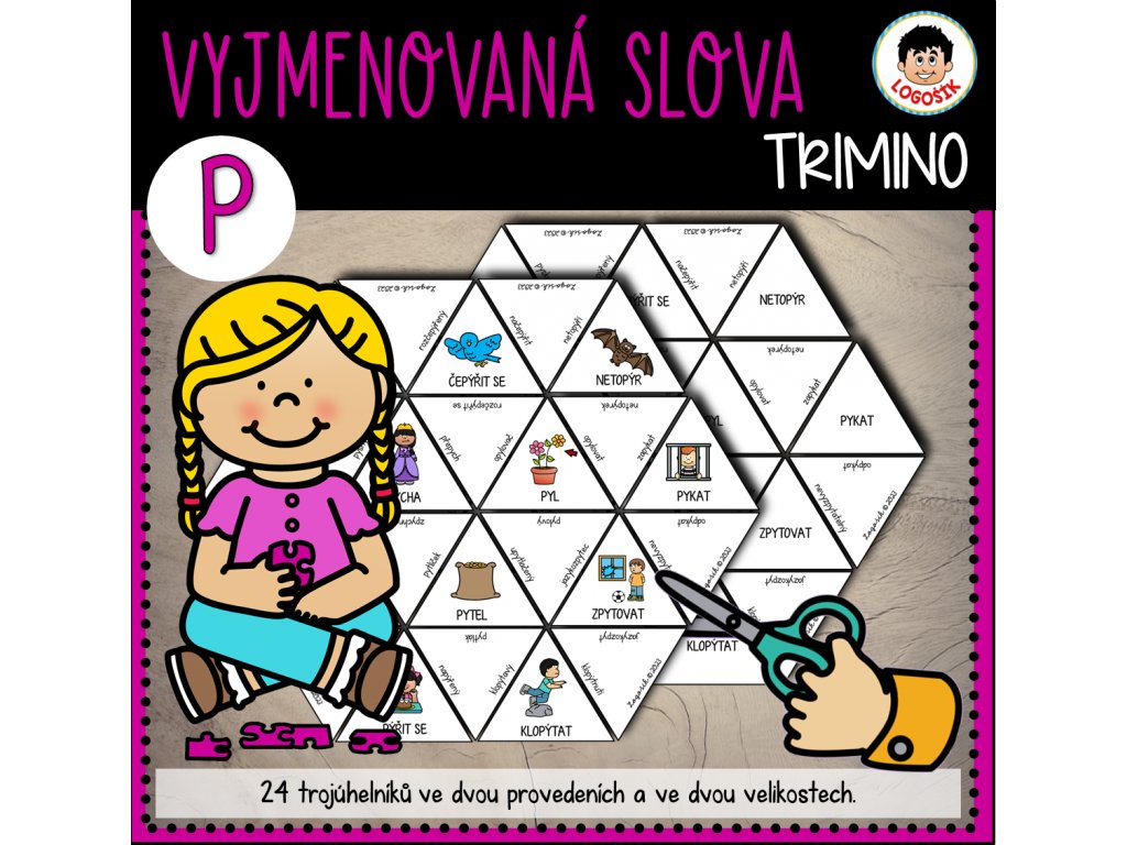 Vyjmenovaná slova po P a jejich slova příbuzná. Pojďme s pomocí trimina hledat příbuzná slova ke slovům vyjmenovaným. Materiál je připraven ve dvou provedeních a každé z nich i ve dvou velikostech. Stačí vytisknout na tvrdší papír nebo zalaminovat, rozstřihat a můžete skládat. Využijete v hodinách pro rychlíky. Trimino je zábava ve které krom vyjmenovaných slov trénujete také logiku.